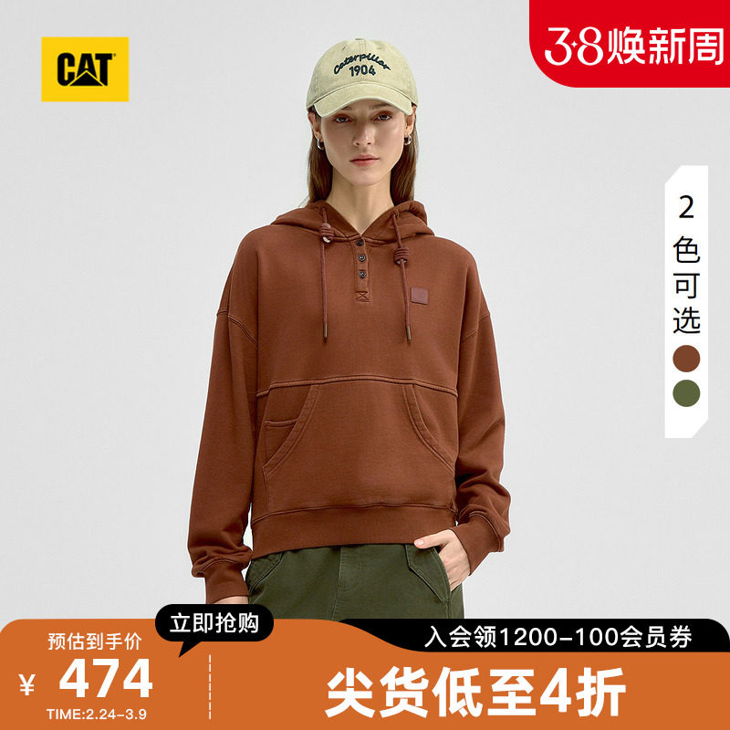 CAT卡特春季新品女士复古抽绳半开襟连帽短款宽松卫衣商场同款