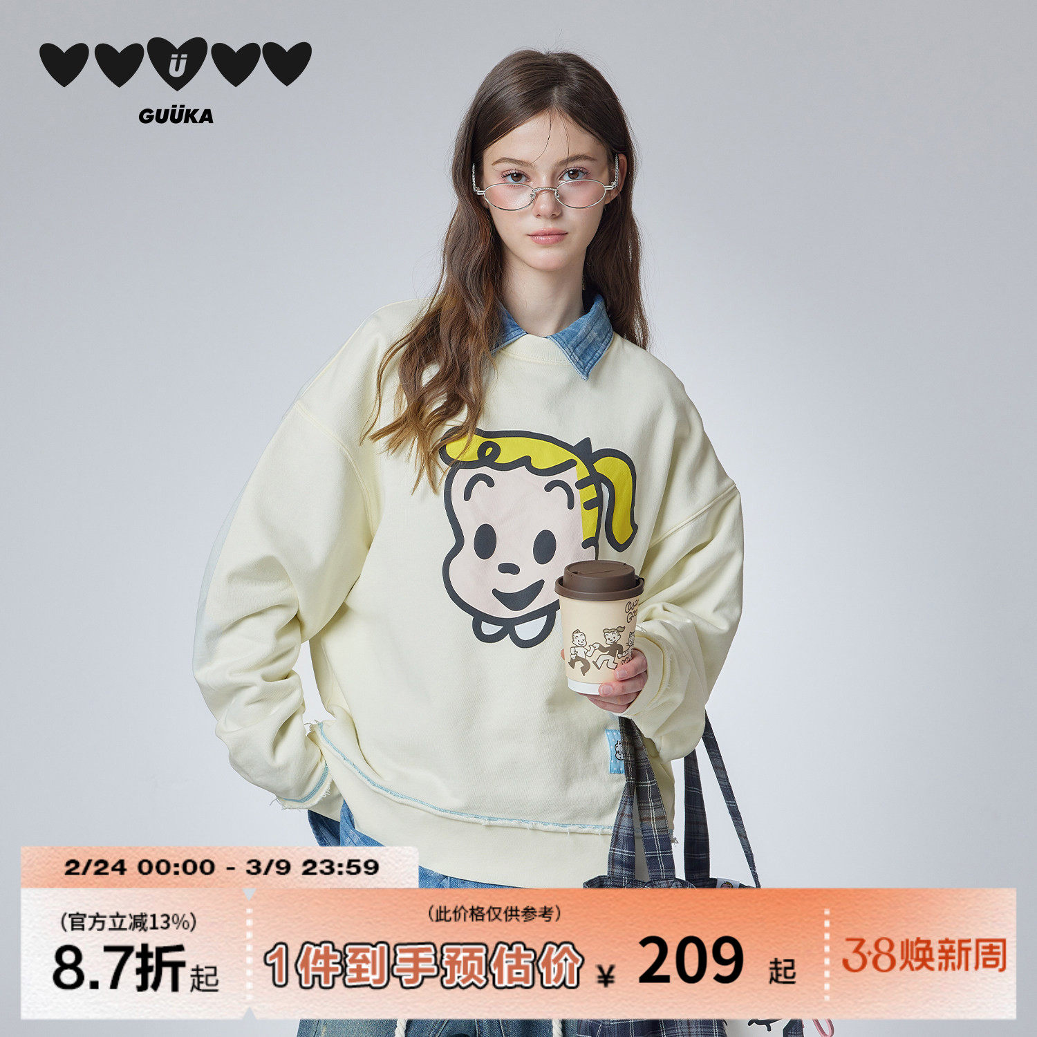 GUUKA&原田治联名吉尔白色宽松卫衣女款重磅纯棉拼接毛边圆领上衣