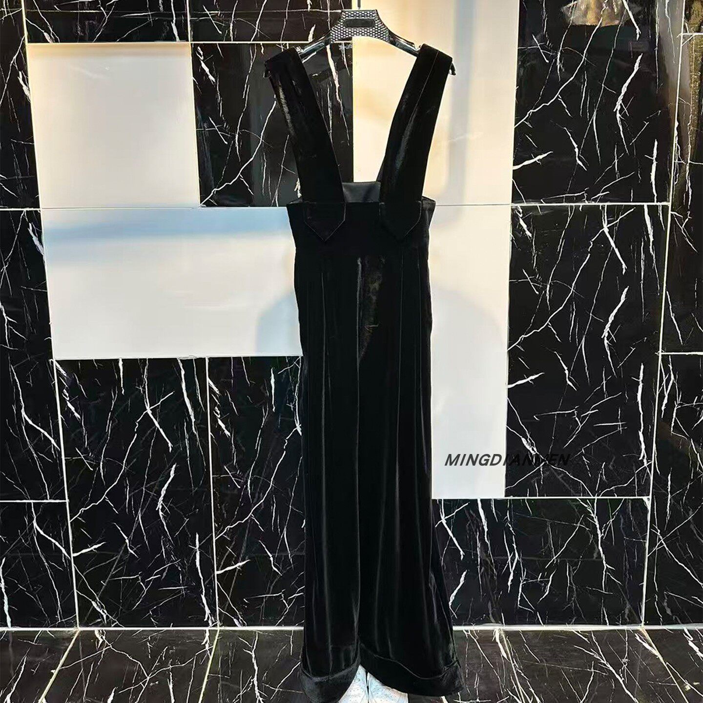 2025年秋冬新款黑色真丝丝绒连体背带裤女高腰气质显瘦直筒长裤