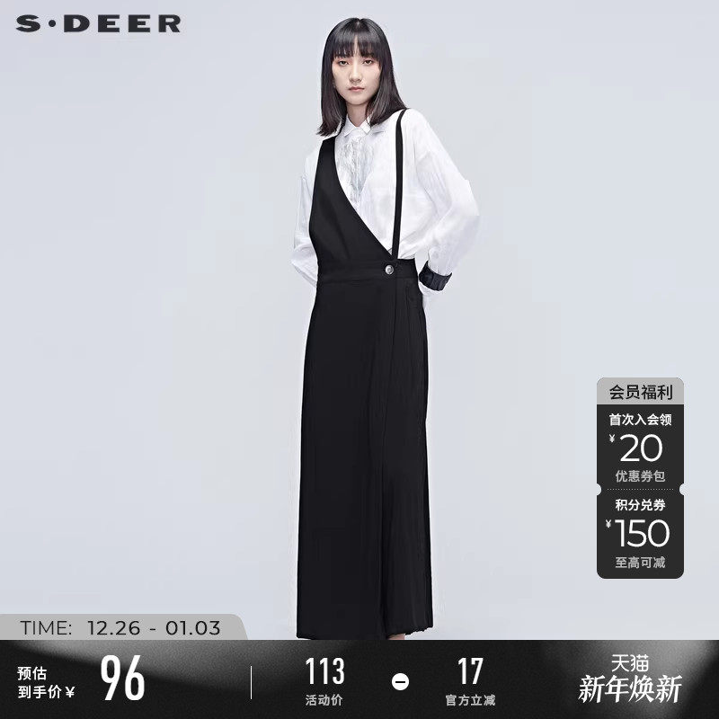 sdeer圣迪奥秋文艺不规则裁剪纽扣阔腿裤女黑色背带长裤S20380816