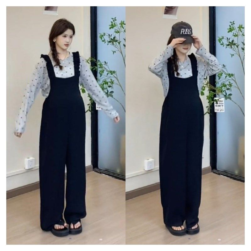 pusumede 黑色灯芯绒背带裤女休闲减龄连体裤宽松阔腿裤拖地长裤