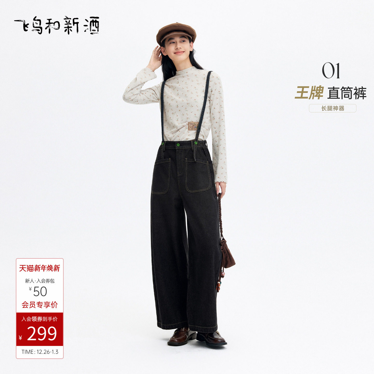 飞鸟和新酒复古显瘦高腰黑色牛仔裤女2025冬季新款直筒背带女裤
