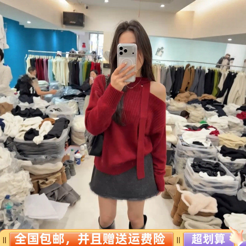 慵懒风红色露肩毛衣女加厚设计感两件套上衣秋冬季亮丝套头针织衫