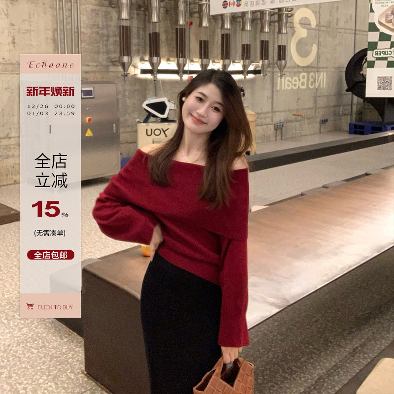一字领套头露肩毛衣女加厚秋冬红色新年露肩慵懒风长袖针织衫外套