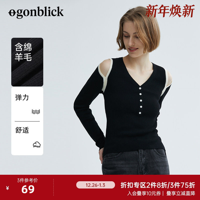 北欧时刻撞色镂空露肩v领黑色打底针织衫女春秋上衣修身套头毛衣