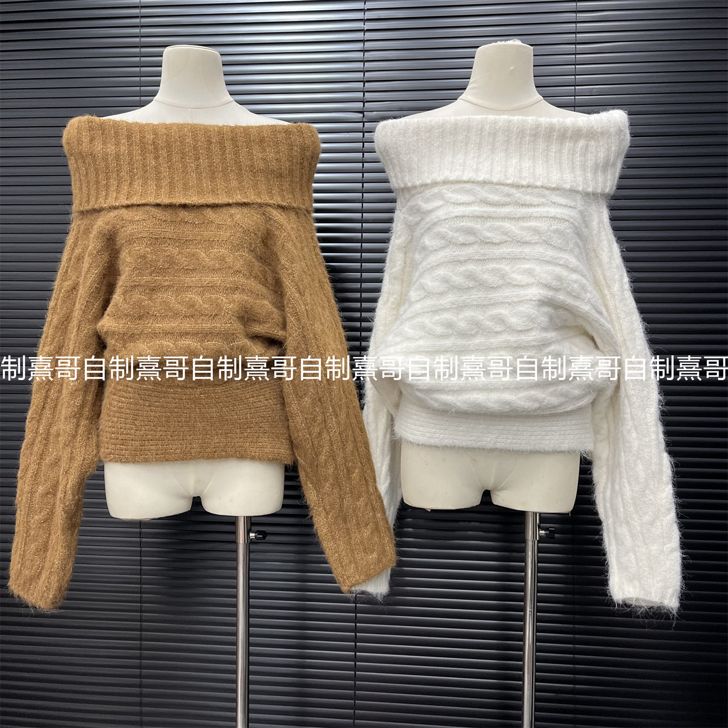 复古慵懒风宽松一字肩麻花套头毛衣女冬季高级感露肩内搭针织上衣