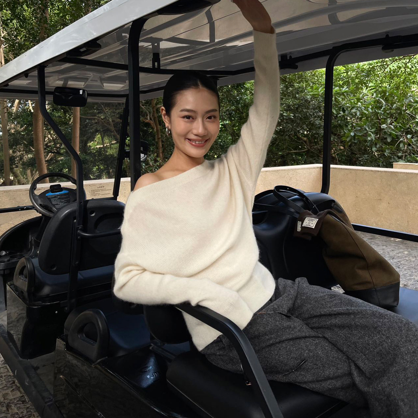 慵懒风一字领露肩山羊毛套头毛衣女设计感韩系宽松斜肩针织衫上衣
