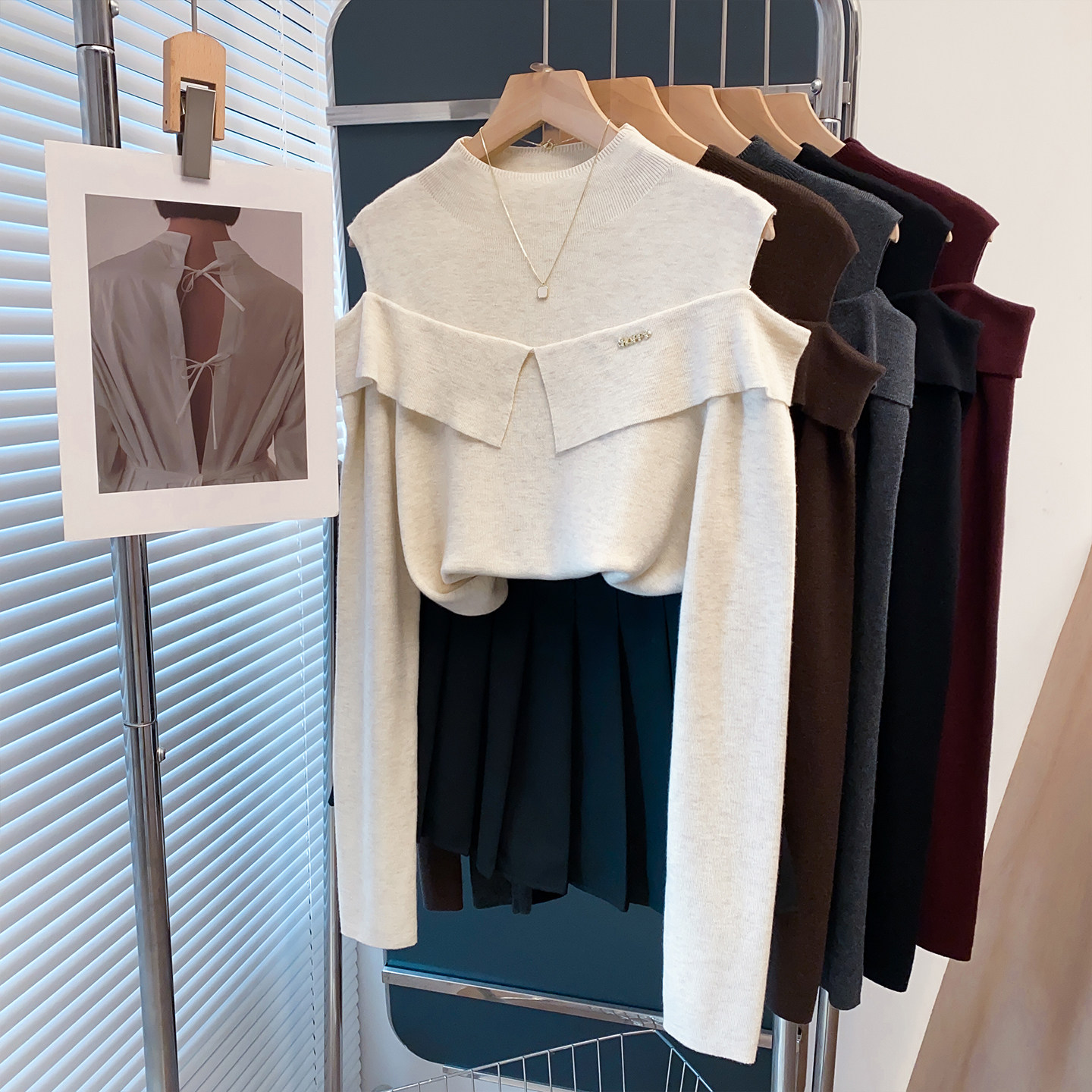郁香菲露肩毛衣女气质优雅秋季时尚拼接长袖套头半高领针织衫上衣