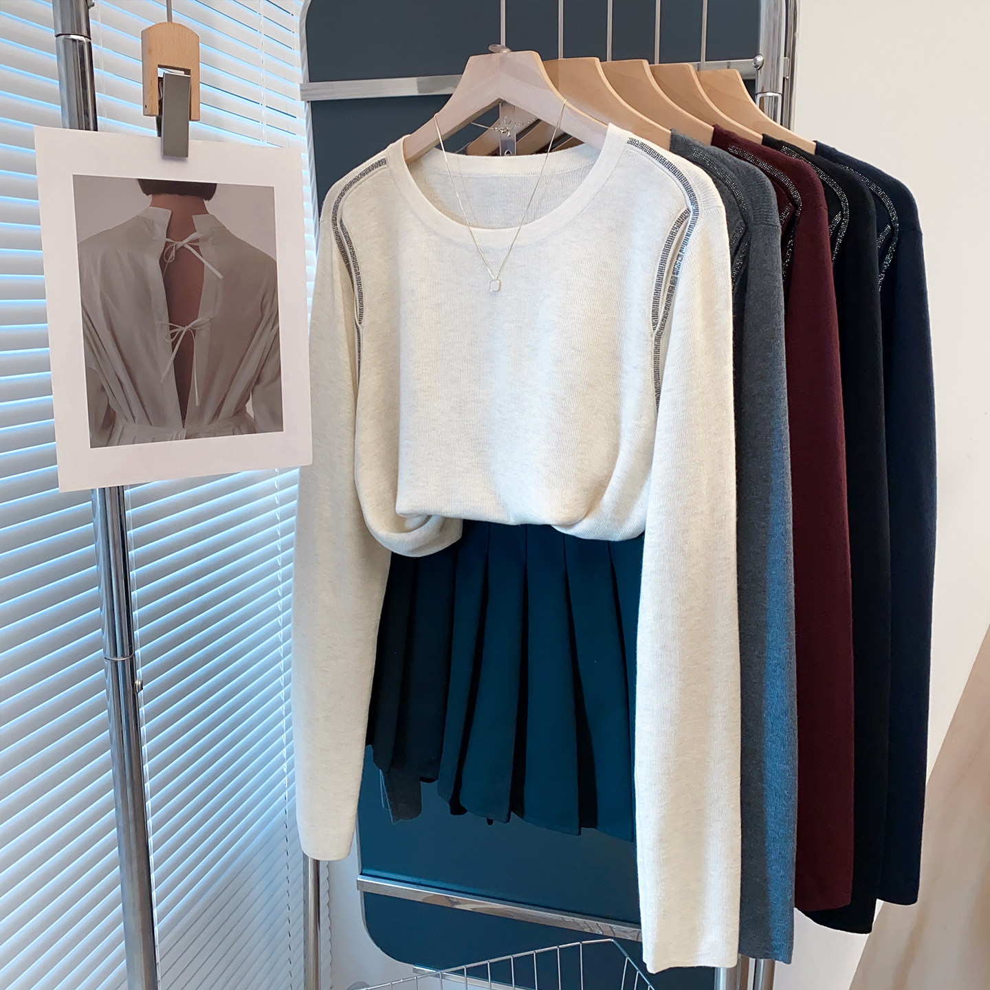 圆领烫钻露肩毛衣女打底衫2025秋冬新款套头宽松针织衫内搭上衣潮
