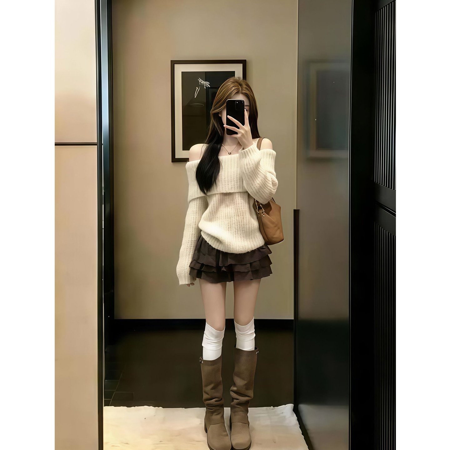 复古风高腰显瘦花边蛋糕半身短裙女氛围感露肩软糯套头毛衣两件套