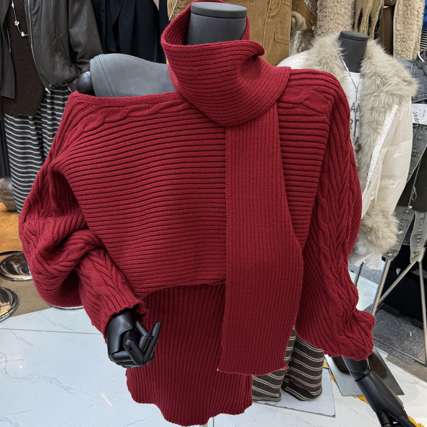 慵懒风穿搭套装新年红露肩宽松套头毛衣显瘦包臀短裙配围巾三件套