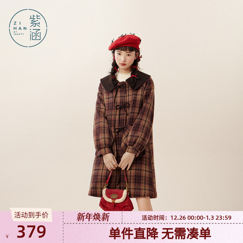 紫涵复古红色格纹毛呢大衣女士冬季新款娃娃领蝴蝶结中长款呢外套