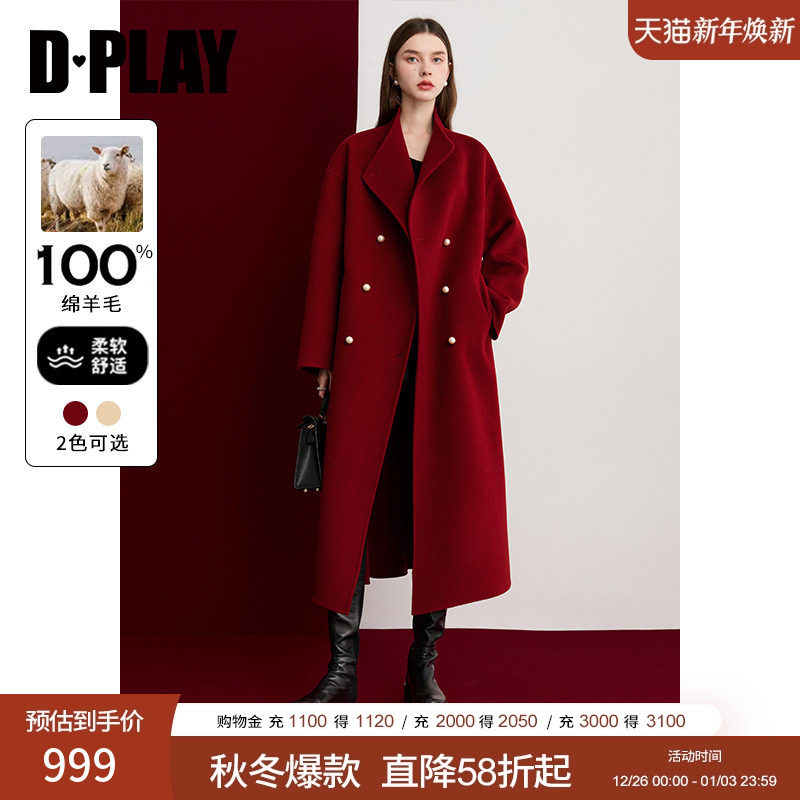 DPLAY2025年冬季新款气质红色大衣女羊毛长款加厚双面毛呢外套女