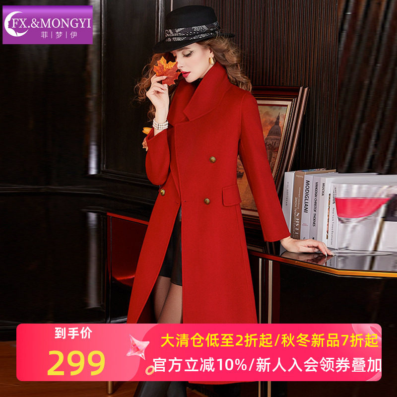 菲梦伊绵羊绒红色大衣女冬季高品质西装领中长款毛呢外套过年衣服