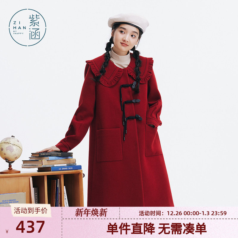紫涵新中式斜襟盘扣红色毛呢大衣女冬季新款设计感中长款羊毛外套