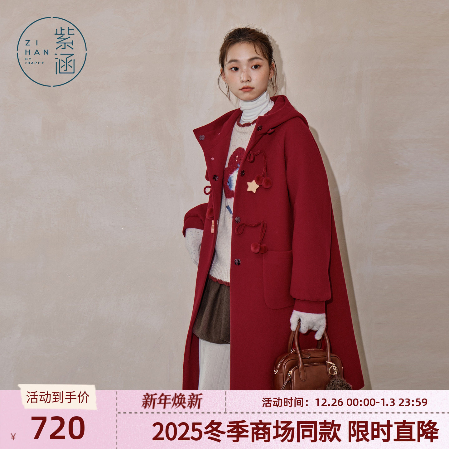 紫涵长款红色连帽毛呢外套女2025冬季新款五角星盘扣宽松保暖大衣