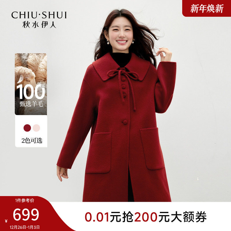 CLOUDSEASON蝴蝶结长款红色外套气质羊毛大衣女春秋100%羊毛外套