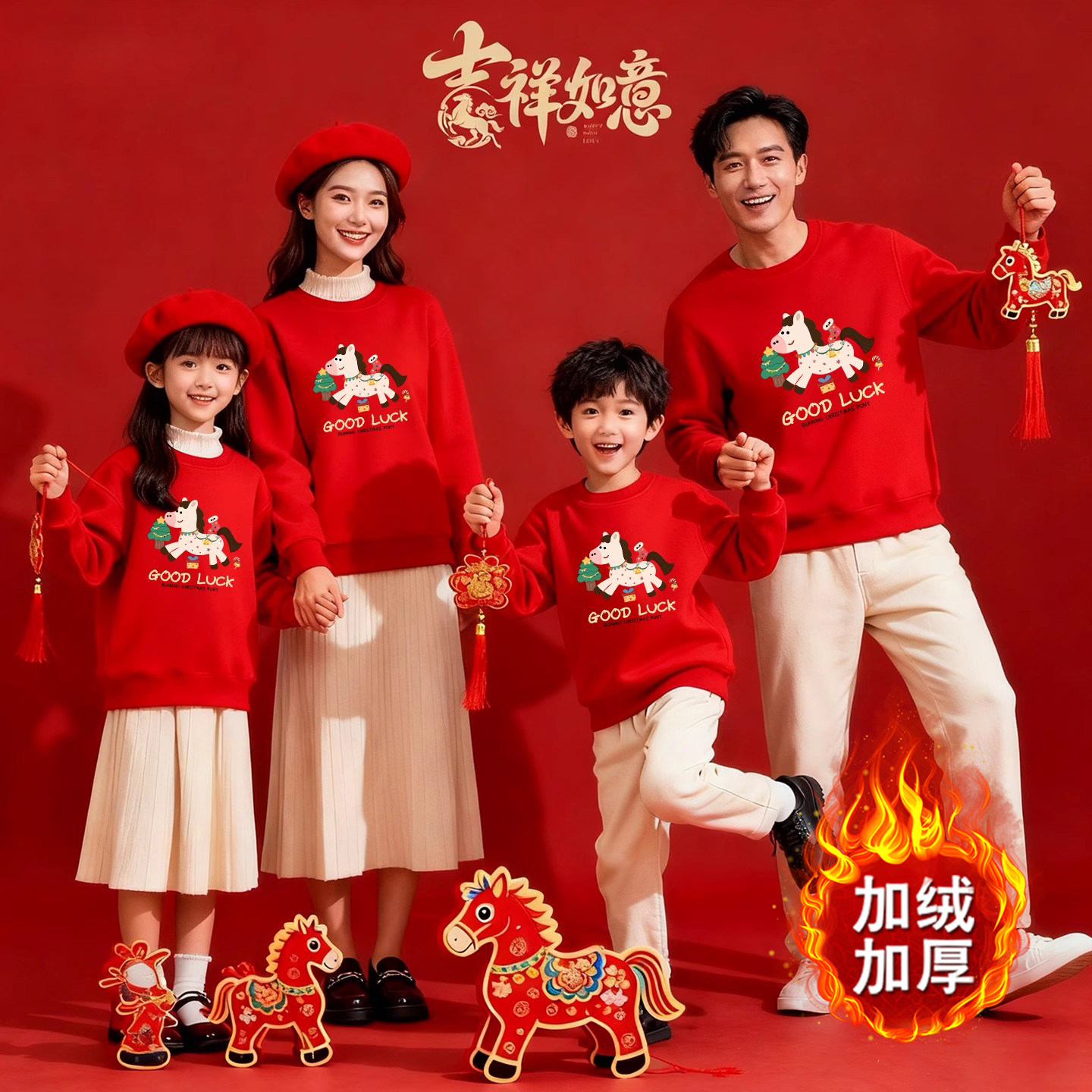 2026马年亲子装红色卫衣一家三口四口冬装母女母子过年拜年全家福