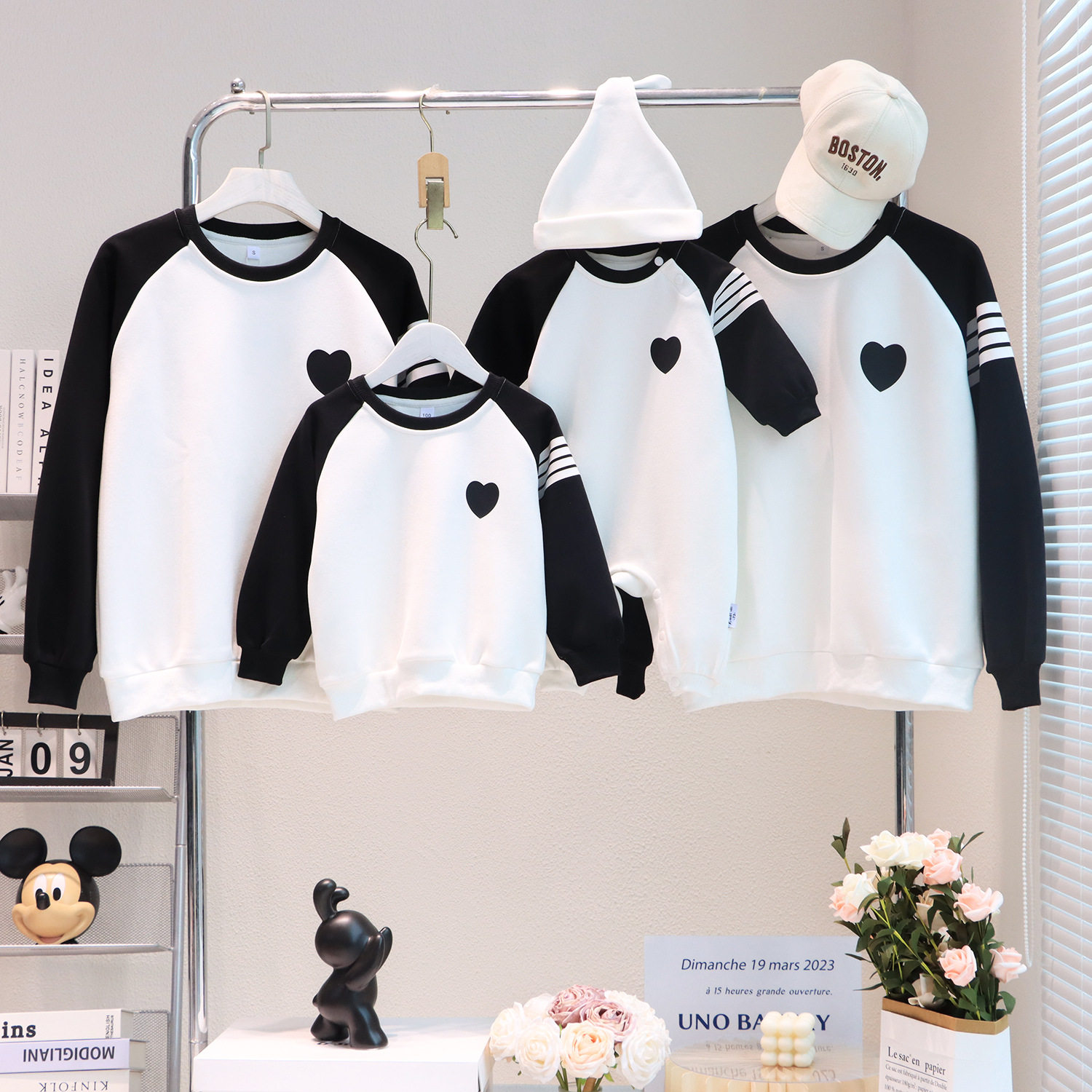 春秋季黑白配爱心图案一家三口四口新款插肩袖简约母女亲子装卫衣