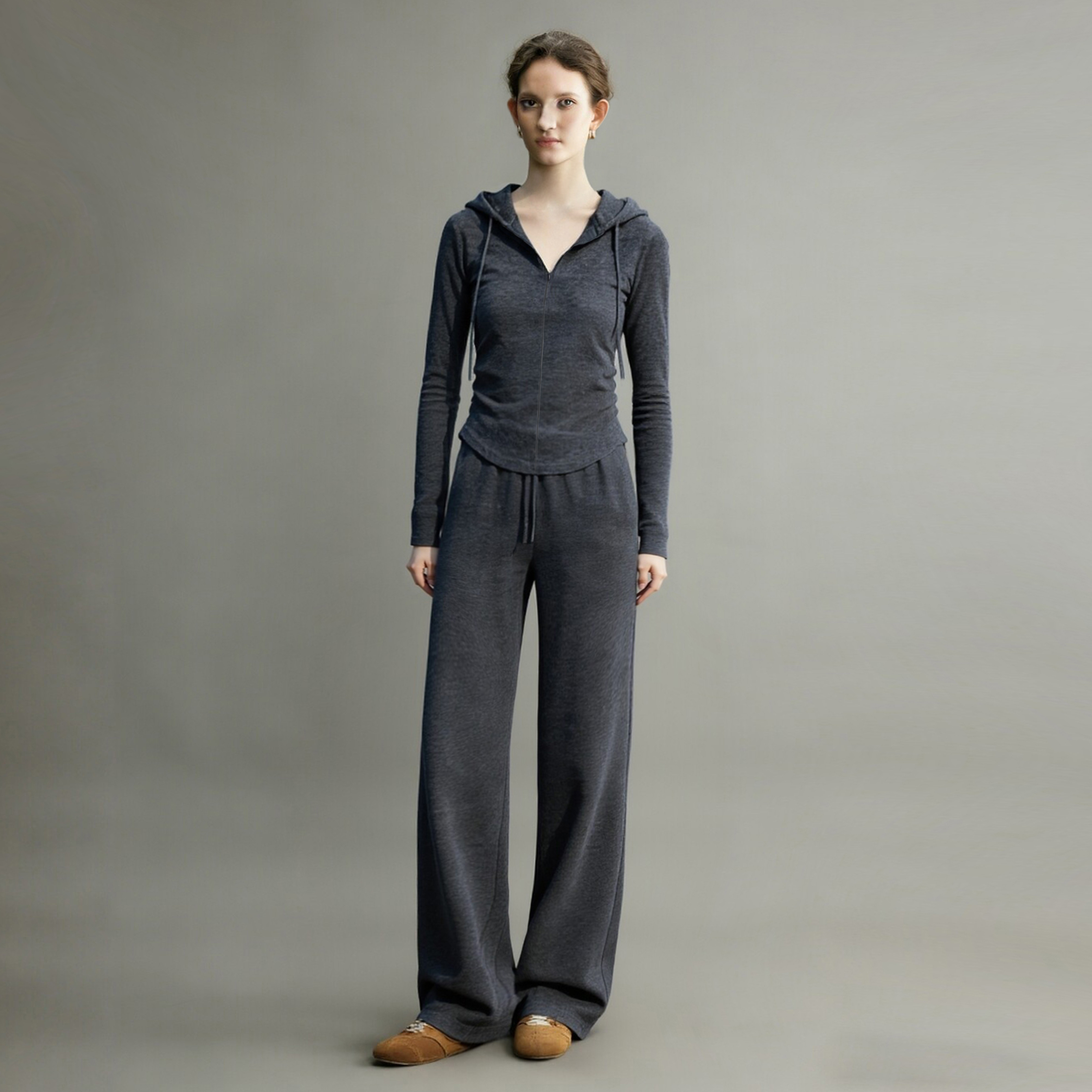 时尚休闲V领长袖显瘦阔腿裤休闲运动套装女春装高级感减龄两件套