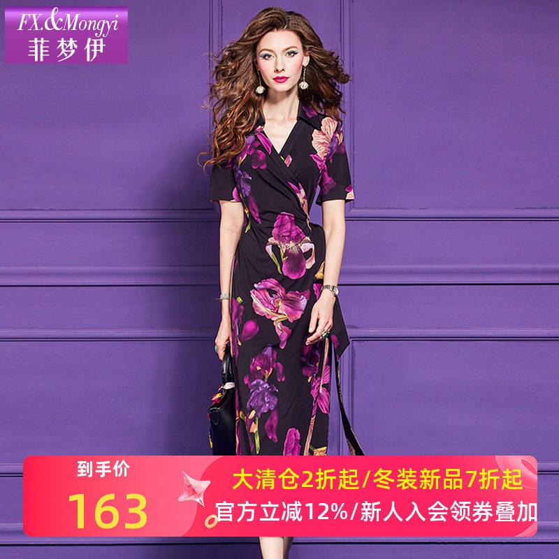 菲梦伊印花黑色连衣裙女短袖夏季复古轻熟收腰V领妈妈大码中长裙