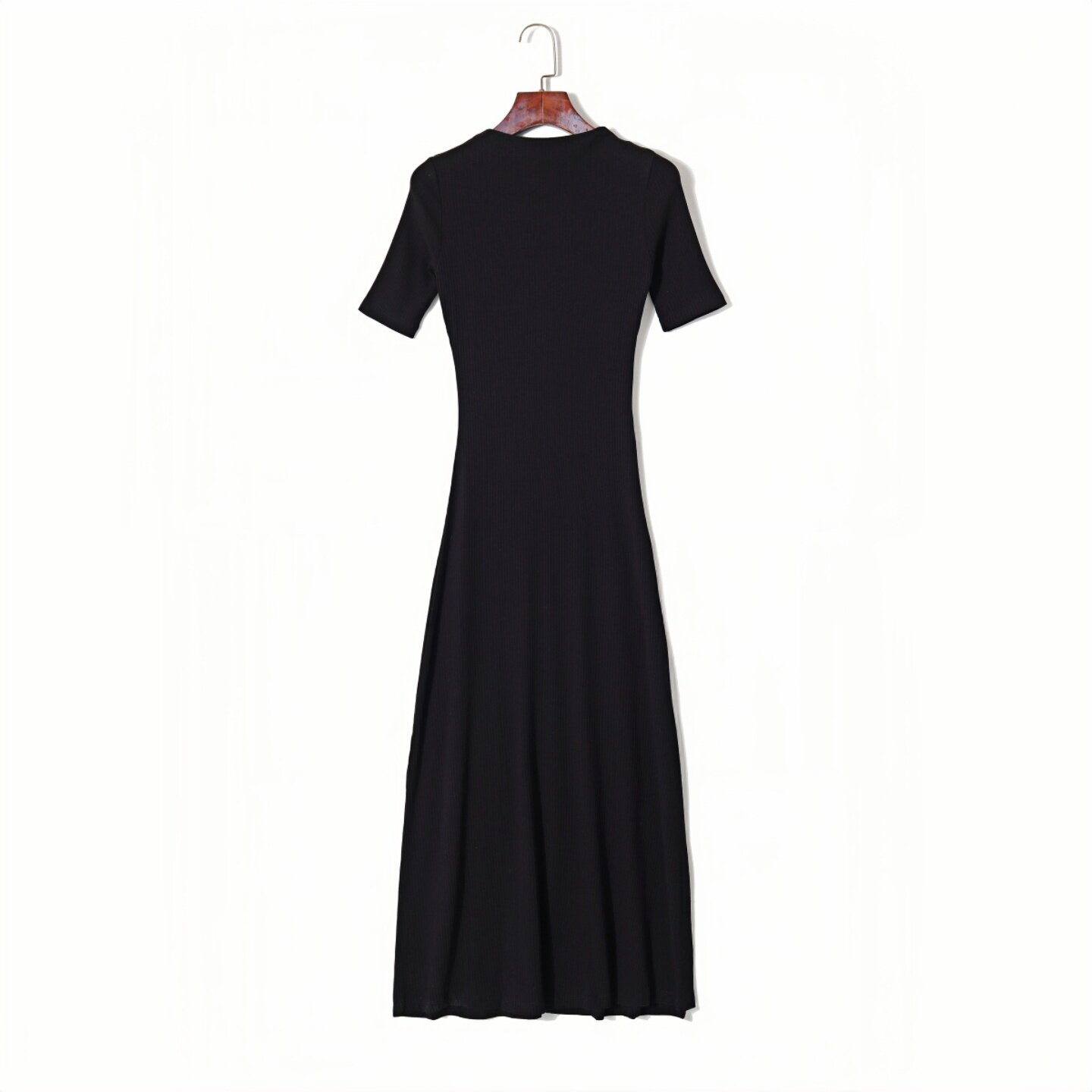 秋冬黑色短袖针织连衣裙女 修身显瘦长款小黑裙 气质百搭过膝长裙