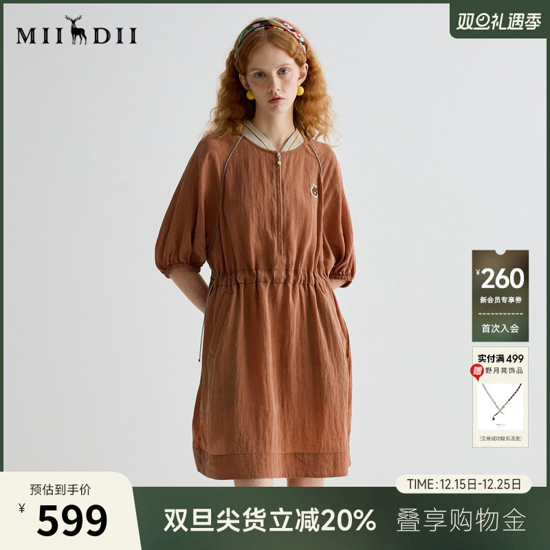 谜底连衣裙短袖女2025夏季新品休闲运动宽松收腰中长裙252ML0686