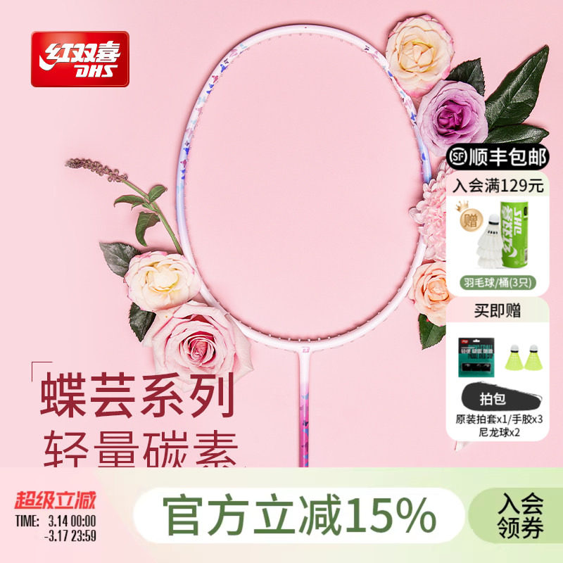 红双喜官方旗舰店 蝴蝶纹羽毛球拍单拍轻量碳素纤维初学业余成人