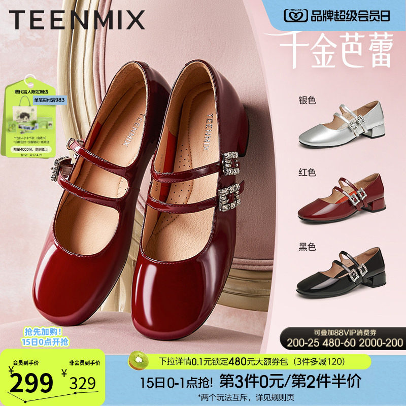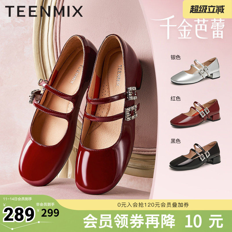 天美意千金芭蕾复古红色玛丽珍小皮鞋高跟鞋女鞋新款粗跟浅口单鞋