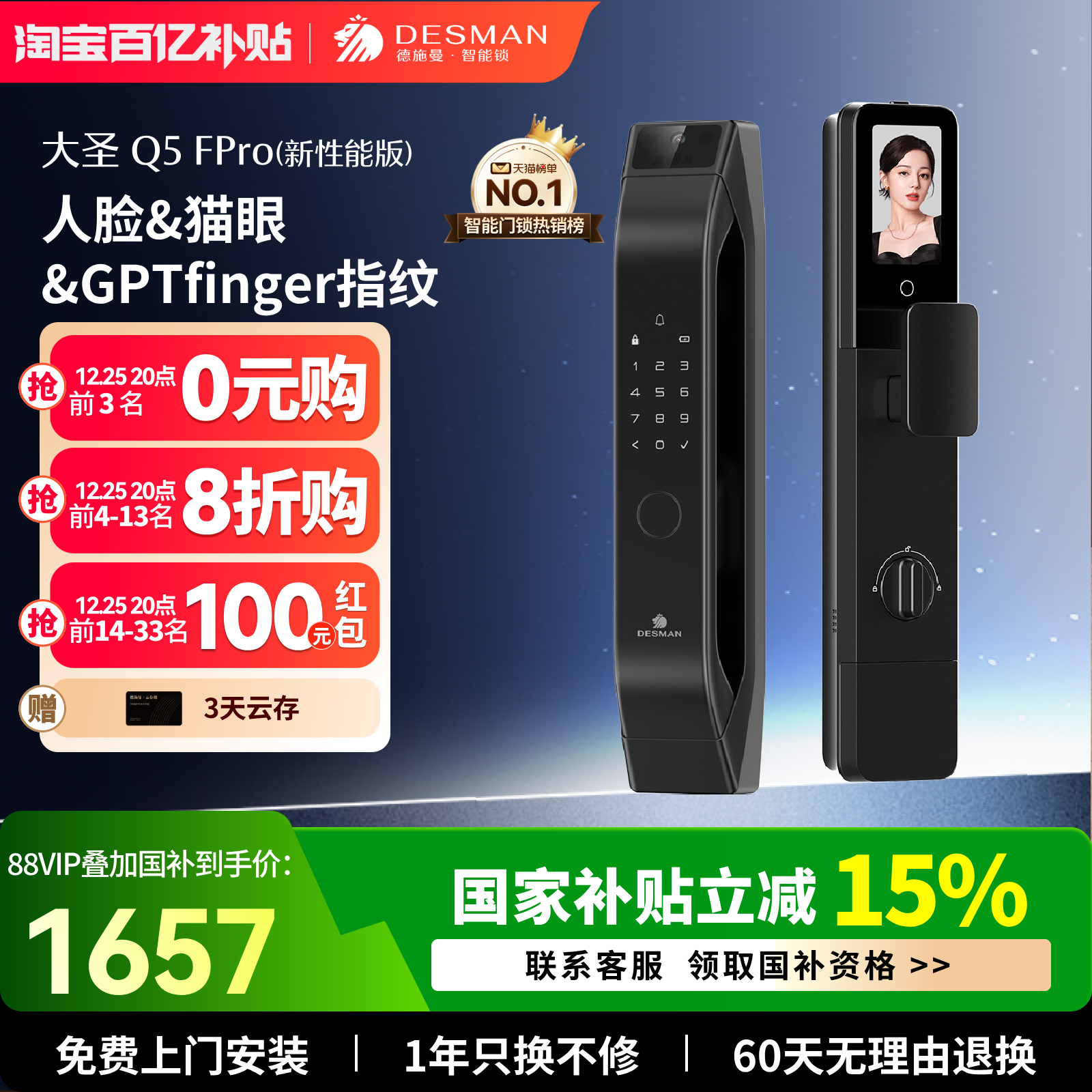 德施曼智能门锁人脸猫眼大屏密码锁指纹锁大圣Q5FPro(新性能版)