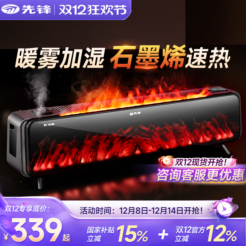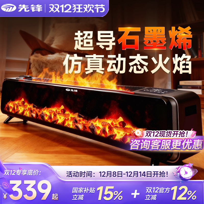 先锋石墨烯踢脚线取暖器家用仿真火焰壁炉客厅加湿干衣智能电暖气