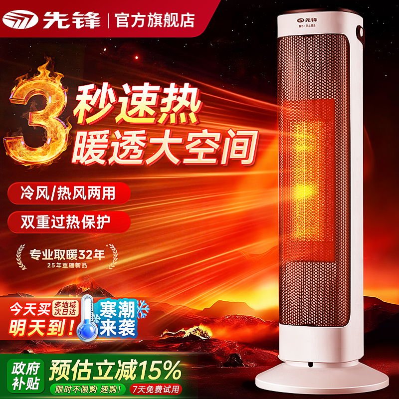 先锋小太阳取暖器家用烤火炉电暖气速热升降电热扇暖风机2025新款