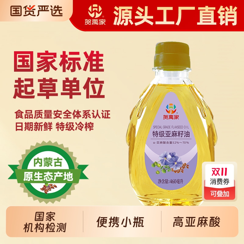 亚麻籽油贺万家特级冷榨460ml内蒙古纯正宗官方正品家用胡麻油